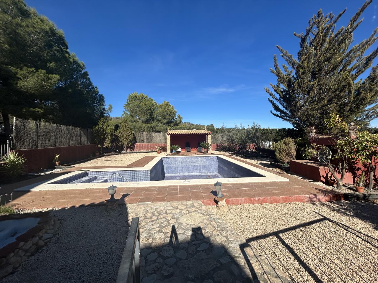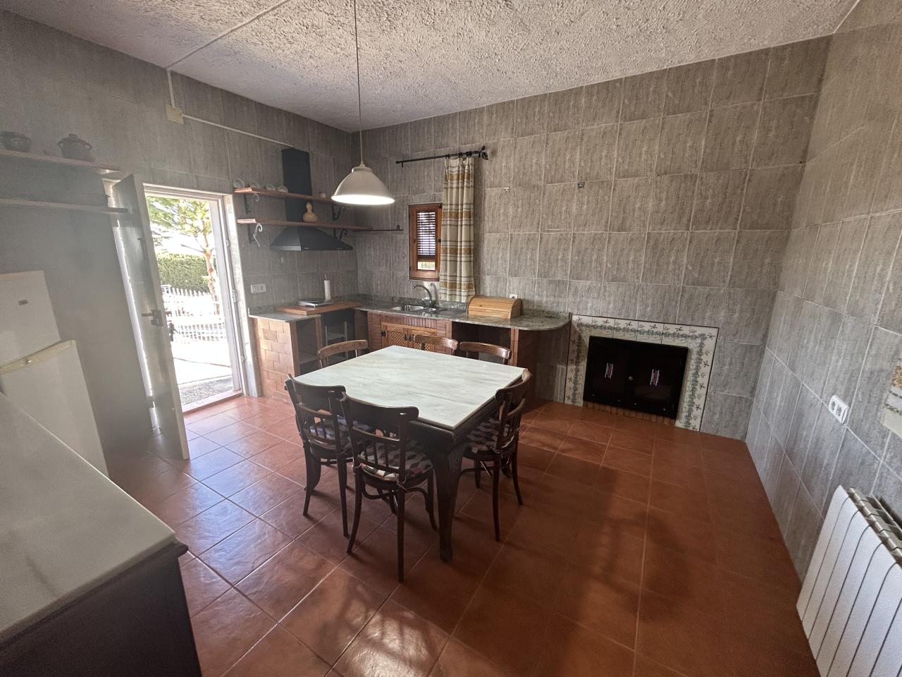 La construcción principal es una casa espaciosa y luminosa, con 3 dormitorios, 3 baños, garaje, y un salón-comedor acogedor que se integra a la perfección con el entorno. En el exterior, destaca una práctica y agradable zona de barbacoa, ideal para reuniones familiares y momentos al aire libre.